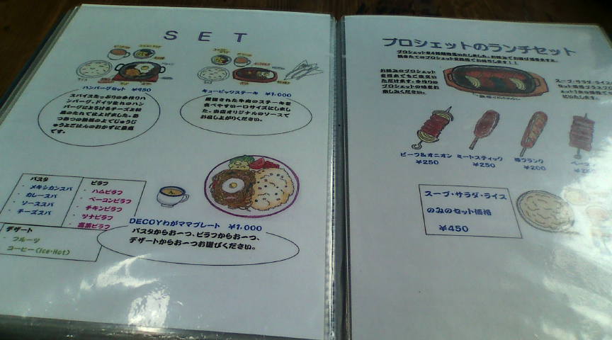 DECOYのメニューです。わがママプレート(1,000円)を注文しました。 ![]() ランチメニューもあったので、こちらも紹介しておきます。 ![]() 画像から伝わるでしょうか、大変なボリュームです。やっとのことで食べ切りました。 ![]() |