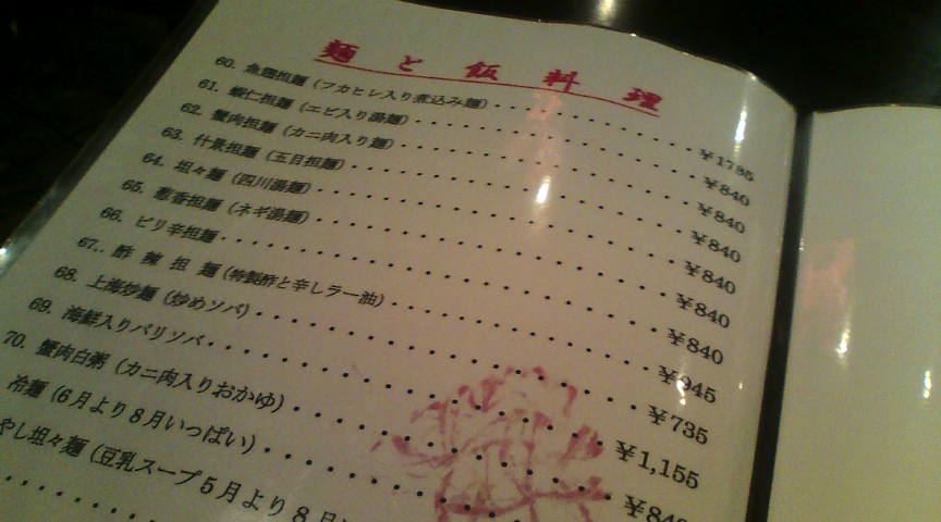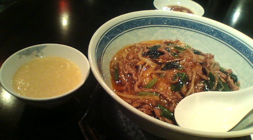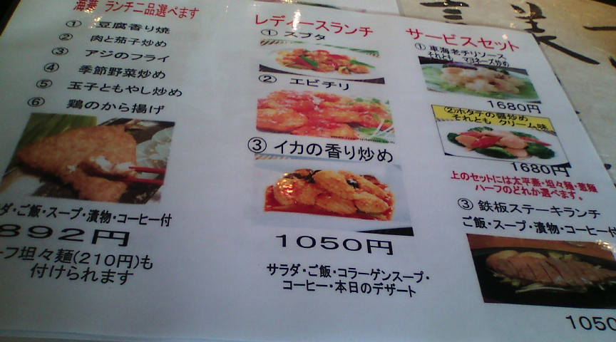 海華のメニューの一部。一品料理はそこそこの値段が付いています。 ![]() 海華のメニューその2。このページのメニューなら私でも食べれそうです。 ![]() 牛肉の餡かけの様なものがご飯にかけてあります。予想以上に美味しい味がしました。 ![]() 餃子は肉の臭みがなく、美味しくいただきました。 ![]() 勢いでデザートも注文してしまいました。しめて1837円、今度はランチを食べてみようと思います。 ![]() (追加画像)お昼のメニューです。右端のサービスセット@1680円を注文しました。 ![]() 前菜の魚のニンニク醤油漬けです。 ![]() メイン料理です。大ぶりのエビでしたが、大ぶりすぎて口の中が熱かったりします。 ![]() セットの麺は選べるのですが、私は塩ラーメンを選びました。これ、とっても美味しかったです。 ![]() 最後のデザートです。コーヒーゼリーには味がほとんどありませんでした。 ![]() |