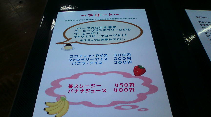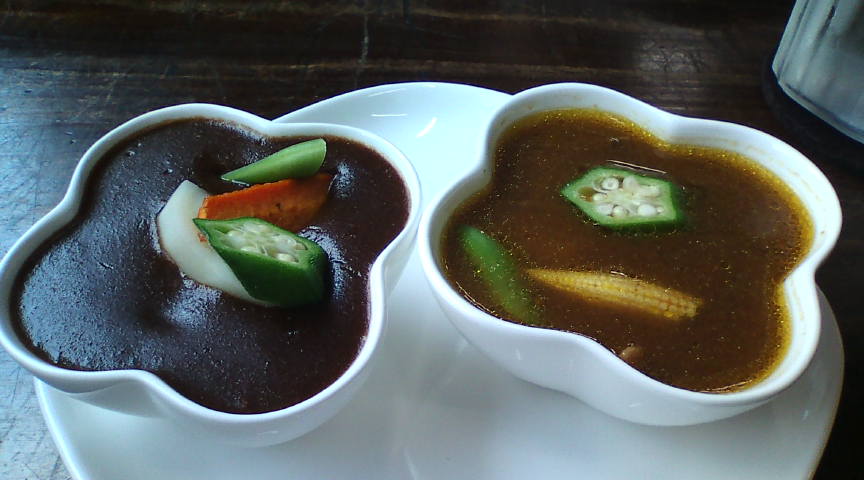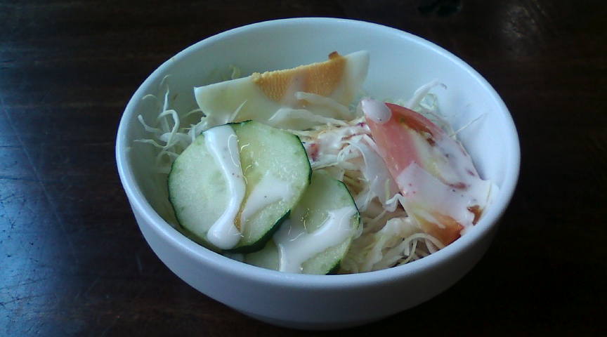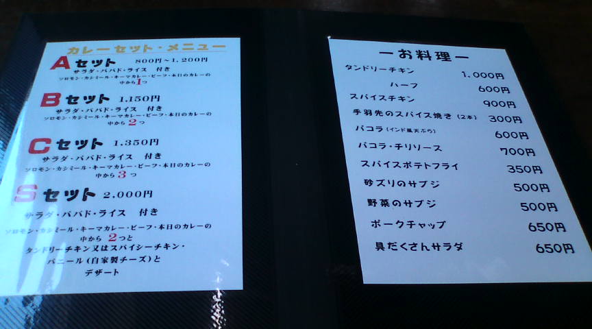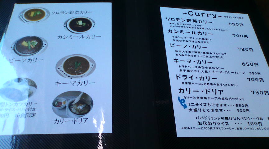 ソロモンの入口にある案内板です。なかなか良い感じです。 ![]() 店内で出されたメニューです。折角なので2種類食べられるBセットを注文しました。 ![]() その他のメニューです。こちらは次回のお楽しみです。 ![]() まず出されたのは野菜サラダ。無難な出だしです。 ![]() ライスとパパド(ひよこ豆を揚げた物)です。パパドはそのまま食べるか、ライスの上に乗せて食べます。 ![]() 左がビーフカレー、右がソロモンカレー(スープカレー)です。私はビーフカレーが気に入りました。 ![]() 急にデザートが食べたくなり、フルーツ入り牛乳寒天を注文しました。 ![]() 程なく出てきたデザート。無難に美味しかったです。 ![]() 締めのコーヒー。こちらも美味しくおいただきました。 ![]() |