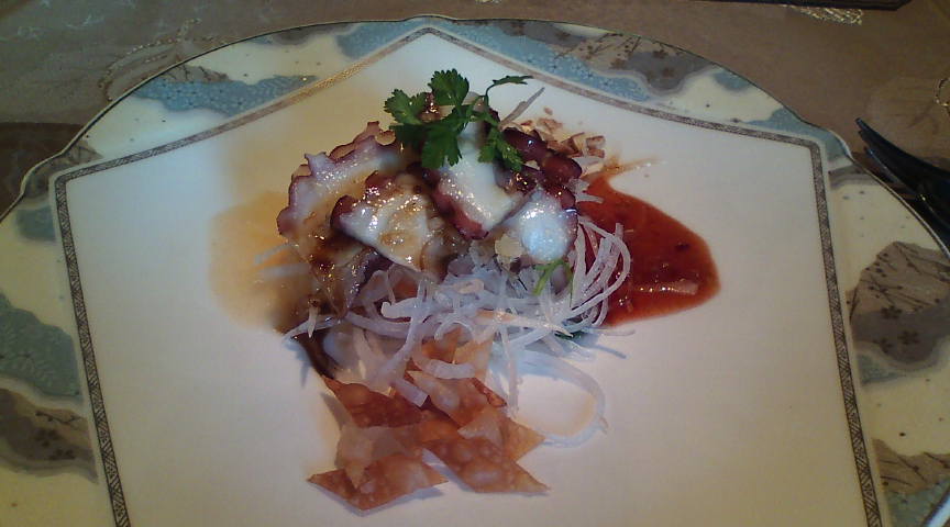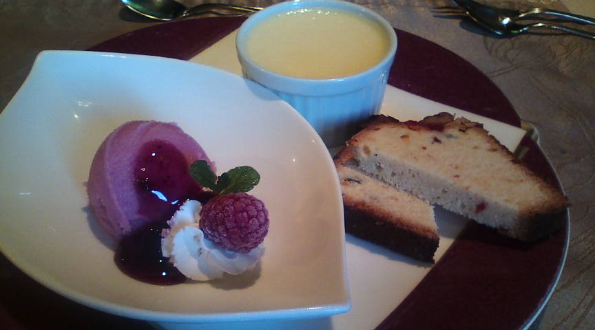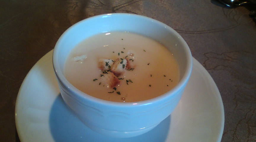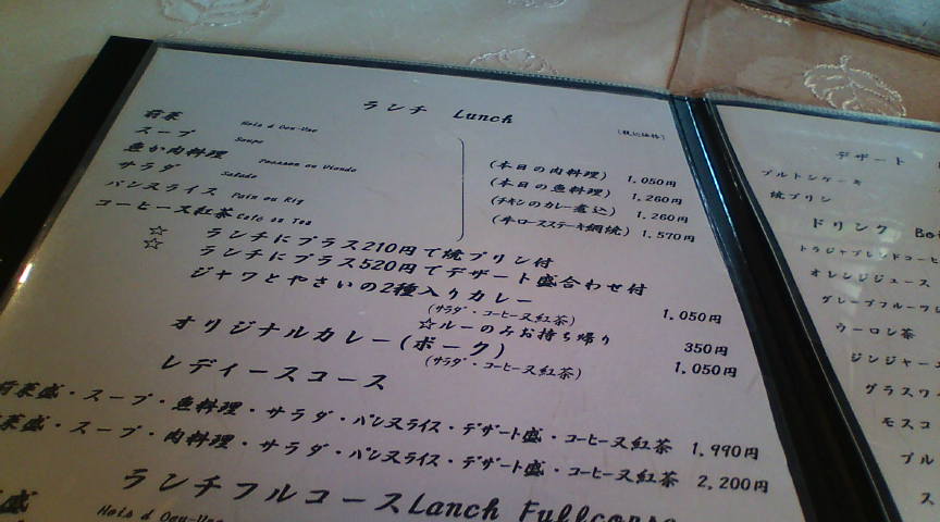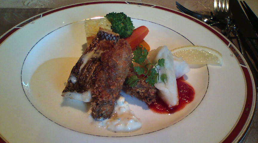 ランチのメニューです。本日の魚料理(1260円)とデザート盛り合わせ(520円)を注文しました。 ![]() 前菜です。蛸の程良い歯ごたえと野菜のシャキシャキ感がマッチしています。 ![]() 蕪のスープ(って言ったかな?)。ジャガイモのスープのような感じで、とても美味しかったです。 ![]() メインの魚料理です。鯛、牡蠣、ジャガイモ(奥)、野菜と海老のすり身かな? どれもイケてます。 ![]() 当然ライスも付きます。サラダもあったのですが、食べるのに夢中で写すのを忘れてしまいました。 ![]() デザートです。どれも美味しいですが、中でも真ん中の焼きプリンが最高でした。これはマジ美味です。 ![]() 唯一残念だったのは、コーヒーが少し渋かったこと。それ以外は何も言うことはありません。 ![]() |