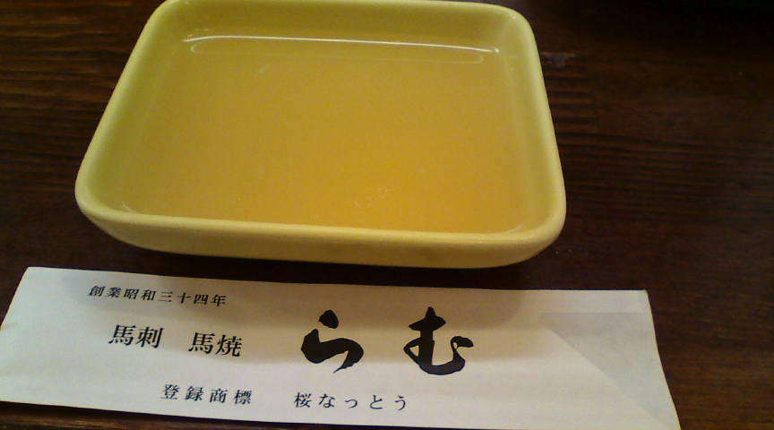 らむのメニューです。さくらコース(4200円)を注文しました。 ![]() 先付けです。馬と大根が煮込んであります。 ![]() 馬刺しです。たてがみは付いていませんでしたが霜降りのきれいなお肉でした。 ![]() からし蓮根と一文字ぐるぐるです。美味しくいただきました。 ![]() 馬焼肉と野菜です。こちらの肉は見た目も良いですが、味も素晴らしかったです。 ![]() 噂に聞いていた、らむの焼肉のたれ。飲めるくらいに美味しいです。 ![]() 桜なっとうの発祥はここのお店でした。「元祖」桜なっとう(商標登録証 第:4420166号) ![]() |
