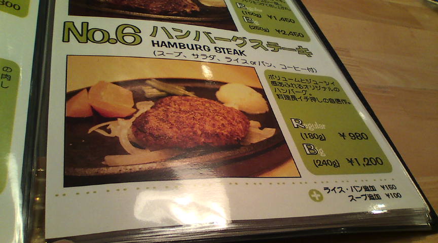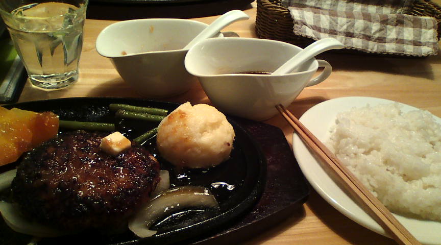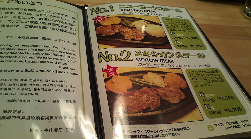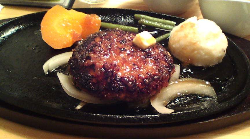 | ●熊本の美味しいお店 最高は ステーキなら旨角−うまかど− 熊本市新市街1-22 サンロード新市街 清元ビルBF 096-355-4255 11〜24(休)月 路面電車の中にある奇妙な宣伝が気になって行ってみることにしました。ハンバーグステーキの180gを注文しました。肉は国産牛ではなかったようですが、味は悪くはありません。980円という値段を考えれば結構良かったと思います。 |