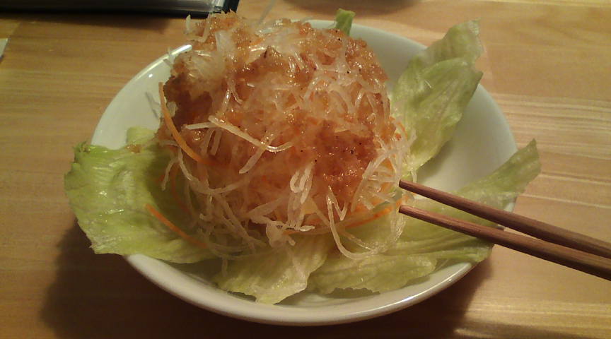 旨角のメニューです。見た感じ国産牛ではなさそうです。 ![]() 値段も手頃だったので、ハンバーグステーキの180g(980円)を注文しました。 ![]() 程なく運ばれてきたサラダです。野菜がシャキシャキしていて美味しかったです。 ![]() メインのハンバーグです。肉の味は悪くありません。添えてあるポテトも美味しく味付けがしてありました。 ![]() ライスまで含めたハンバーグステーキの画像です。同業他社と比べて遜色は無い気がします。 ![]() 仕上げのコーヒー。締めて980円、これならまずまずでしょう。 ![]() |