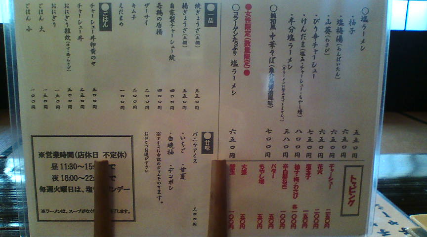 けんだまのメニューです。塩ラーメンにチャーシューをトッピングしてみました。 ![]() 見た目すっきりですが、塩味は思ったより濃かったです。チャーシューの量はそれ程ありませんでした。 ![]() |
