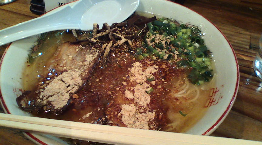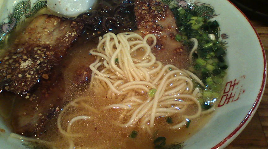 | ●熊本の美味しいお店 最高は 天外天本店 熊本市安政町2-15 096-354-8458 昼19〜翌朝4(金・土は5まで) 日・祝休 某有名百貨店のバスケットボール部の監督さんに連れて行っていただきました。ニンニクがたっぷり入ったラーメンですが、スープは意外にもあっさりで、美味しくいただけました。麺は細麺で博多風、チャーシューも結構イケてました。滅茶苦茶美味いというほどではないのですが、必ず行列のできる有名店です。ある意味くせになるラーメンなのかもしれません。 |