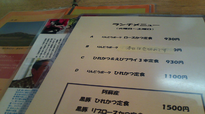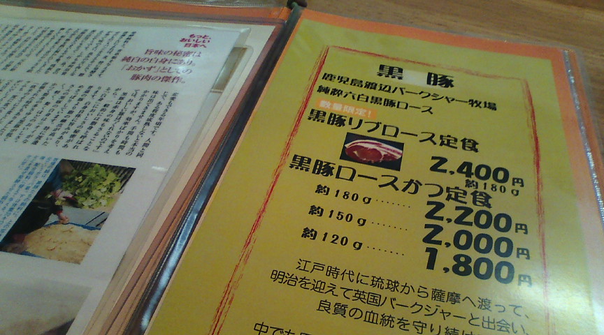 萬のメニュー。黒豚はそれなりの値段がしますが、メニューの雰囲気からも美味しさが伝わってきます。 ![]() ランチのメニューです。 ![]() ヒレカツを頼んだのですが、更新をさぼっていたためどのヒレカツなのか忘れてしまいました。 ![]() 久しぶりに訪れた萬で、ヒレカツカレーを食べました。とても贅沢なカレーです。 ![]() |