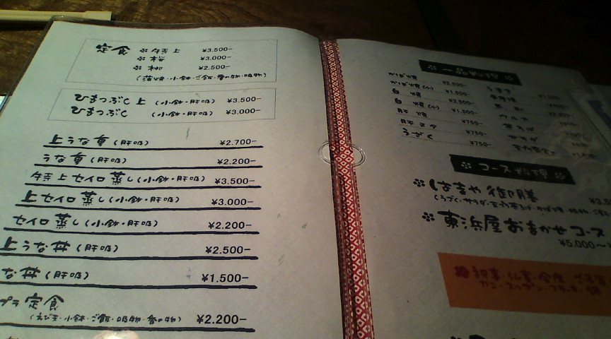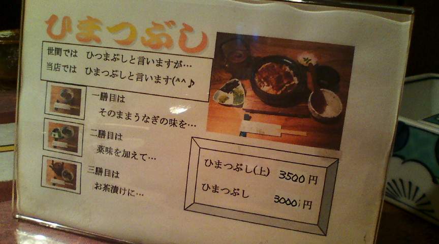 うなぎ「東浜屋」のメニューです。値段はちょっと高めの設定です。 ![]() いつかは食べてみたい「ひつまぶし」。この店では「ひまつぶし」と呼んでいるようです。 ![]() |