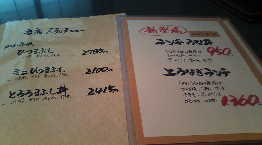 うなぎ「かわ専」のメニューです。 ![]() 本当はひつまぶしにしたかったのですが、財布と相談して上うなぎランチにしました。 ![]() 上うなぎランチです。隠れていますが、ウナギの骨も付いてきます。ウナギのたれが絶妙です。 ![]() ウナギの拡大図です。もう少しウナギが大きいと言うこと無しなのですが… ![]() |