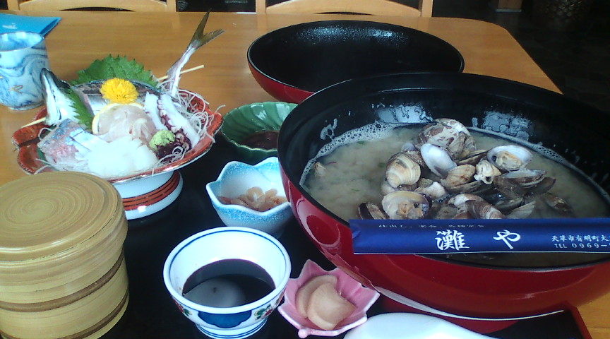 | ●天草・牛深の美味しいお店 最高は 和食 灘や 天草市有明町大島子2370-6 0969-52-0138 刺身がたっぷり入った「刺身定食」とアサリの貝汁がついた「貝汁定食」がお勧めのお店です。とりわけ「貝汁定食」は我が目を疑うほどの巨大な貝汁(直径30センチの大椀)がついており、その迫力に圧倒されます。 |
