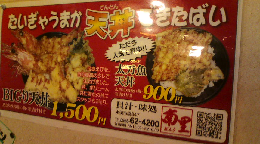 | ●八代・水俣の美味しいお店 最高は 貝汁味処南里(和食) 熊本県水俣市袋847 0966-62-4200 10:00〜15:00 17:00〜22:00 定休日なし ランチが出来るお店が少ない水俣にあって、昼時は結構混雑しているお店です。料理にはボリュームがあり味もなかなかです。この日は地元特産の足赤エビを使ったBIGり天丼(1500円)を頼みましたが、かなりのボリュームでした。 |