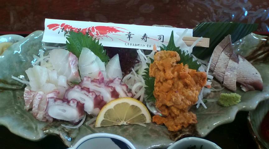 | ●天草・牛深の美味しいお店 最高は 和食 幸寿司 天草市五和町二江4806-1 0969-33-1644 五和町にある知る人ぞ知る寿司屋です。二江港で水揚げされたばかりの新鮮なネタを食べさせてくれます。時期にもよりますが、ここのお勧めは生うにでしょう。私が頼んだのは「生ウニとお刺身定食」(だったと思う)でしたが、異常なほどに盛られた甘いウニが衝撃的でした。 |