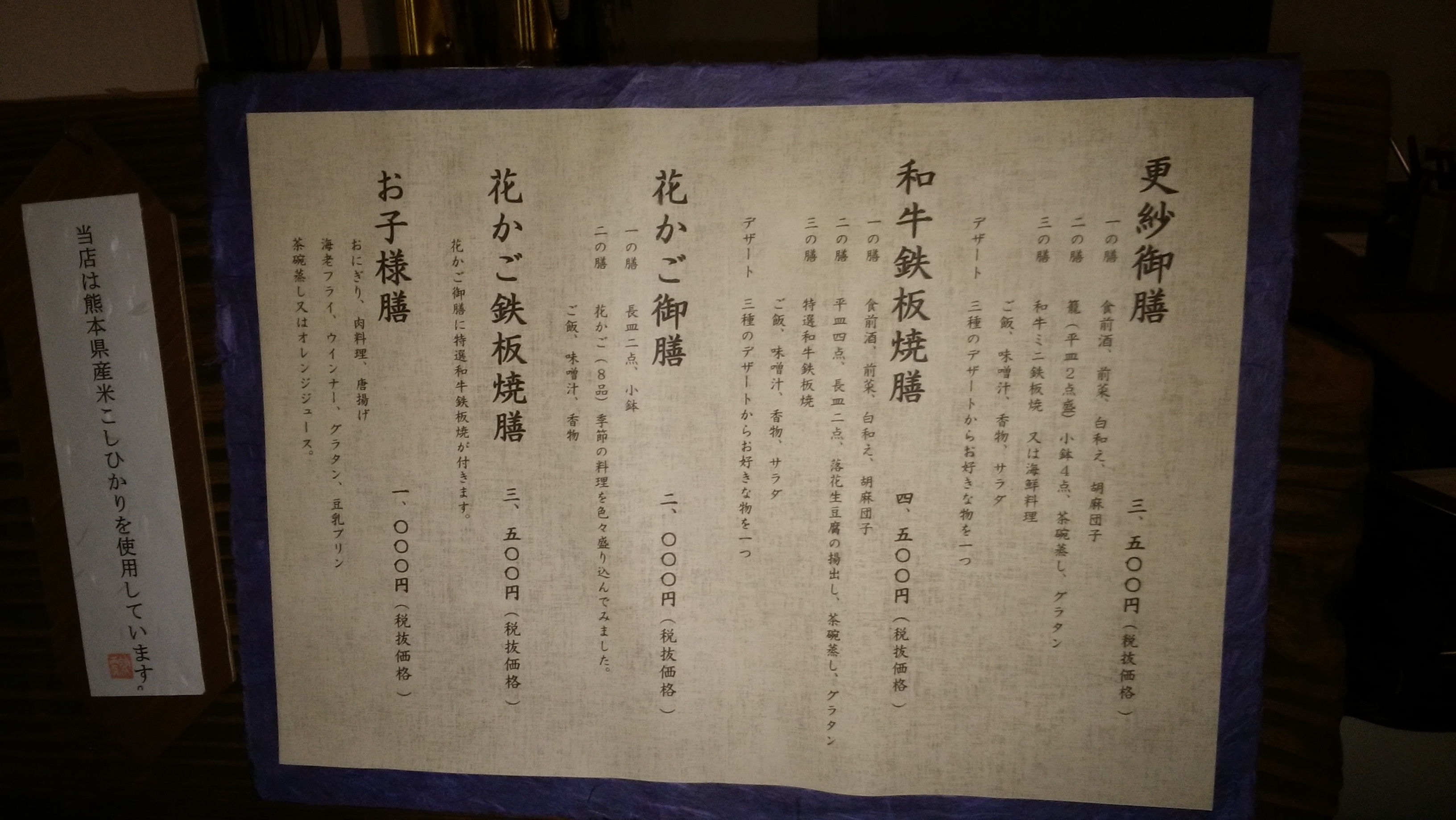 | ●熊本の美味しいお店 最高は 更紗(和食) 熊本県阿蘇郡西原村小森2172-7 096-279-3838 (営業時間)11:30〜15:00 17:00〜22:00(21:00オーダーストップ)、日曜営業、(休)木曜日 この日はかつて熊本勤務時代にお世話になったお姉さまと久々の食事でした。熊本空港から俵山方面に向かった途中にある小さな看板を左に入ると5分くらいでお店に着きます。 熊本のお店は結構行っていたつもりでしたが、こちらはノーチェックでした。周りを緑の木々で囲まれた隠れ家的な雰囲気のお店で美味しい和食を食せます。 更紗御膳(3500円)をオーダーしましたが、料理はどれも美味しく満足度の高いものでした。お店の方の対応も丁寧で、好感の持てるお店です。 |