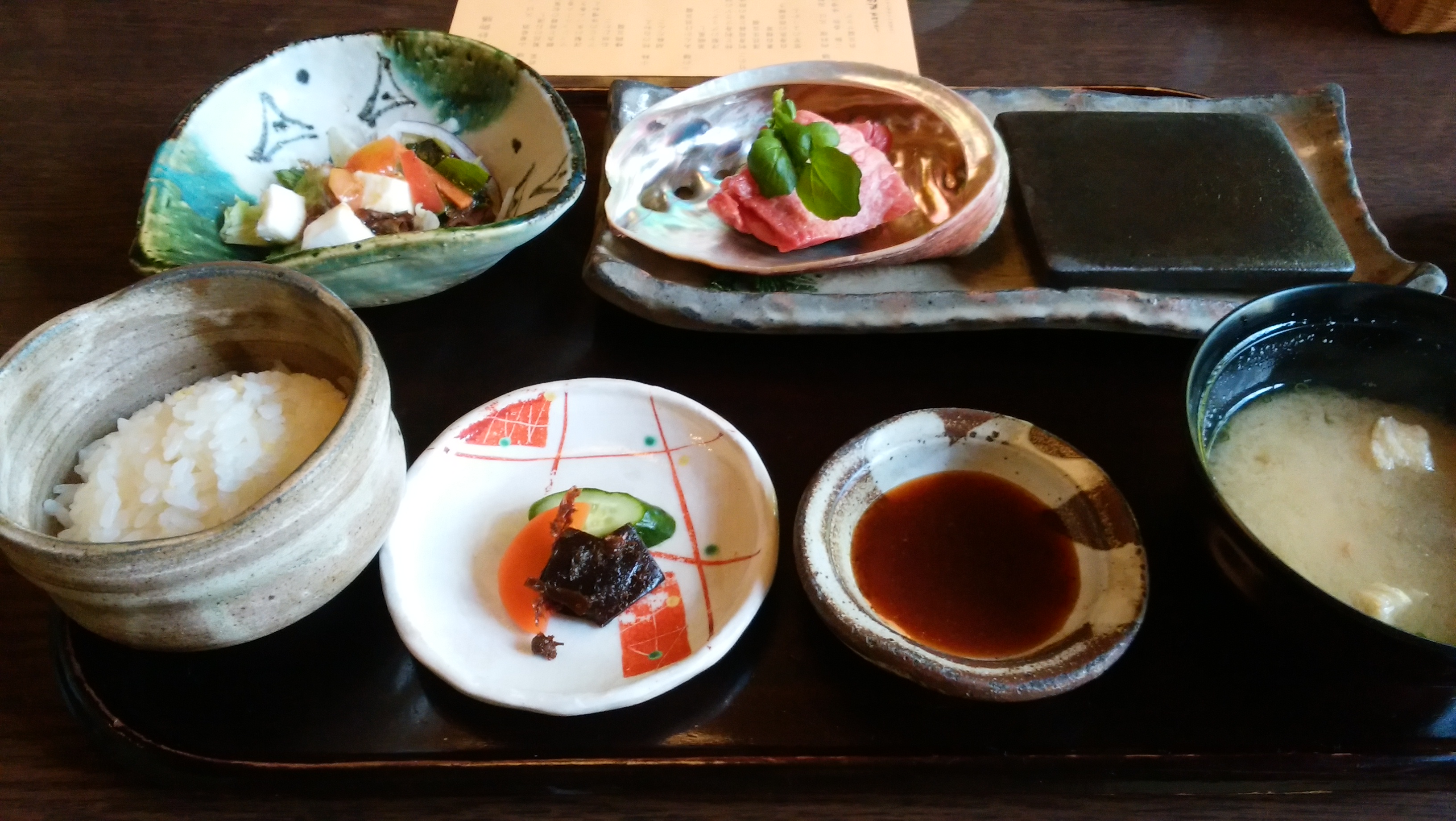 お店の入口にあったメニューです。更紗御膳(3500円)を頼むことにしました。 ![]() お膳が3つ出て来ます。どれも美味しくボリュームもあります。 ![]() 牛の鉄板焼きとご飯です。すっかり満足しました。 ![]() 広い庭園がありますが、きれいな滝も流れていました。 ![]() |