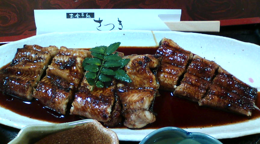さつきのメニューです。鮎以外にも色々ありましたが、今日の目的は球磨川の天然鮎です。 ![]() 鮎の塩焼き定食(2000円)です。特大の鮎が焼かれて出てきました。 ![]() 兎に角大きな鮎です。箸の大きさと比べてもお分かりかもしれませんが、いわゆる尺鮎です。 ![]() ようやく念願が叶いました。2年越しで天然ウナギを食べることが出来ました。 ![]() このボリュームで、天然ウナギで2800円。信じられない安さです。 ![]() 脂が乗っているのに全くしつこさがありません。うなぎ自体の美味さで見れば私史上最高です。 ![]() 厚みが何と言っても凄いんです。食べたい人は電話で確認をしてから行って下さい。 ![]() |
