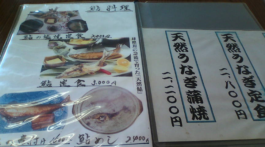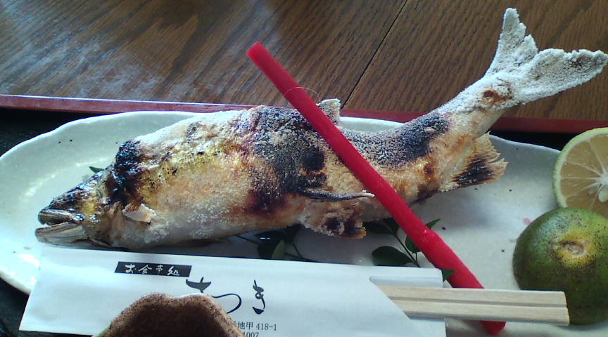| ●熊本の美味しいお店 最高は さつき(和食) 熊本県球磨郡球磨村一勝地418-1 0966-32-1007 球磨川特産の天然鮎を食べさせてくれるお店です。2000円の鮎の塩焼き定食を頼みましたが、何と体長30p、重さ300gの超大型鮎が出てきました。この大きさにまでなると圧巻ですが、まだまだ大きいのがいるとのこと。味も超美味で大満足でした。 ⇒ ついに念願の球磨川天然ウナギを食べました! レポートは当サイト内下段をご覧ください。 |