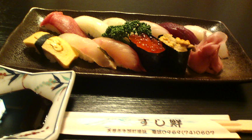 | ●天草・牛深の美味しいお店 最高は すし鮮(和食) 熊本県天草市牛深町3473-5 キムカズさんのブログで紹介されていたお店で、以前から行きたいと思っていました。この日は上にぎり(1800円)を食べましたが、味もよく合格点のお寿司屋さんです。牛深という場所柄(帰りがきついので)、お昼にやってもらえると嬉しいなと思いました。 |