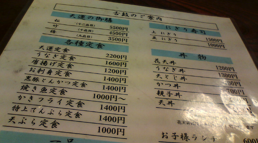 天運のメニューです。並みの天丼なら600円で食べることが出来ます。 ![]() このお店の人気メニューは天丼です。画像は花天丼(1200円)です。 ![]() 特上天ぷら定食(1400円) ![]() 特上天ぷら定食の天ぷら拡大画像です。衣が薄くてとても美味しいです。 ![]() |