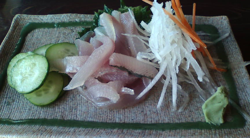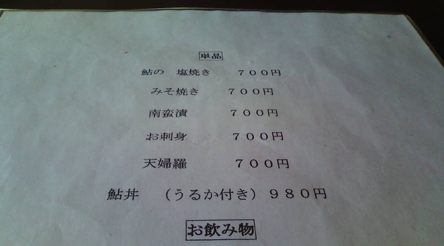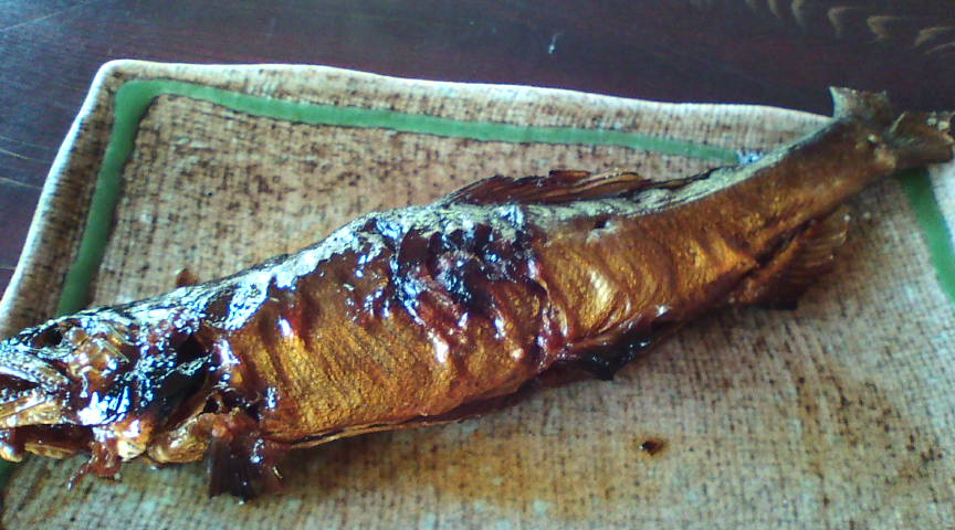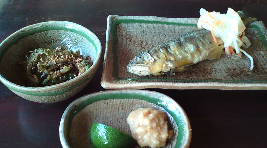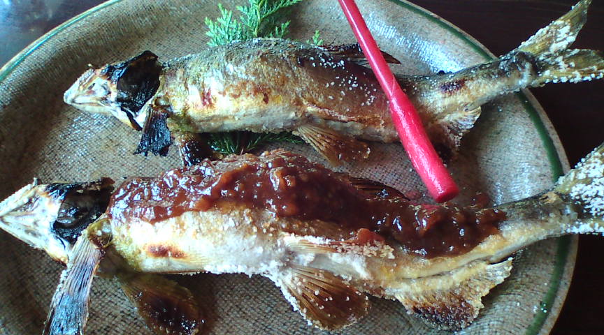 やなもとコースを注文しました。注文後に生きた魚を捕まえに行きます。 ![]() 小鉢・南蛮漬け・うるか(卵の塩漬け)です。南蛮漬けは頭も食べられます。 ![]() 続いて出てきたお刺身ですが、臭みが全くありません。とても美味しいです。 ![]() ついさっきまで生きていた鮎の塩焼き、味噌焼きです。当然骨抜きも簡単に出来ました。 ![]() さらに鮎の煮つけも出てきました。もうお腹がいっぱいですが、それでも美味しく食べられます。 ![]() 吸い物と漬物です。漬物は全て自家製、お吸い物には鮎が入っています。 ![]() 単品メニュー。鮎の天ぷらも是非食してみたいところです。 ![]() |