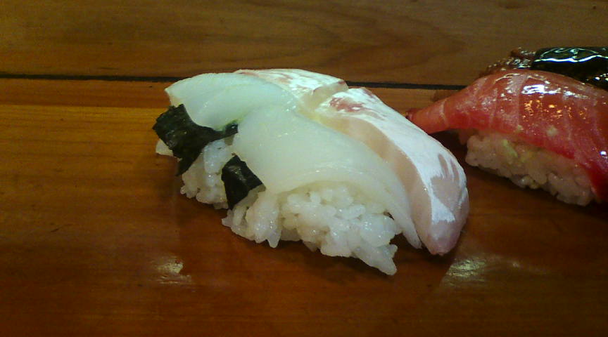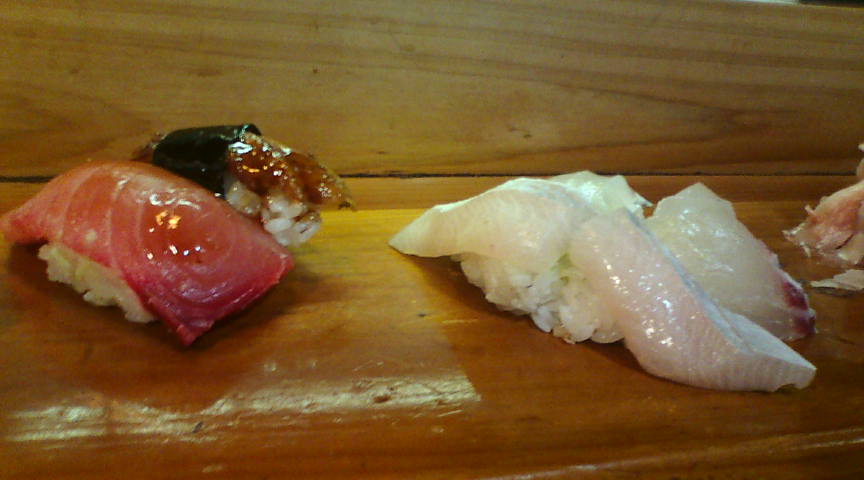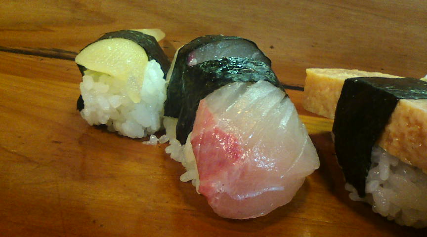 最初に出てきたのは鯛・カンパチとマグロとウナギ。ネタが大きいため2つに切ってあります。 ![]() 続いて鯛とイカですが、こちらも超新鮮。繊細さはありませんが、そんなことは全く気になりません。 ![]() 続いてエビとタマゴ。大振りのエビが口の中いっぱいに広がります。 ![]() 最後の2貫のアップ画像。美味しさが画像から伝わると思います。 ![]() 寿司10貫と汁物がついて1300円。信じられない安さです。手の込んだ寿司では ありませんが、最高に美味いネタの乗った寿司を格安で食べられる凄いお店です。 ![]() |