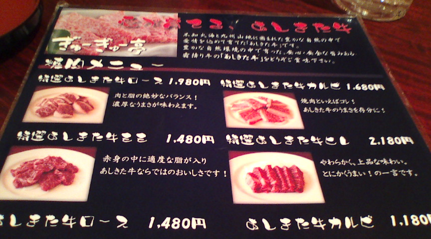 | ●八代・水俣の美味しいお店 最高は ぎゅーぎゅー亭(焼肉) 熊本県葦北郡芦北町佐敷443 0966-82-3691 食べ放題もあるのですが、この日は芦北牛の焼肉を注文しました。特選あしきた牛もも(1,480円)を頼みましたが、やはりももと言う部位のためか、肉臭さがありました。ネットの書き込みを見ると、ここはきっと食べ放題のバイキングがお奨めなのでしょう。 |