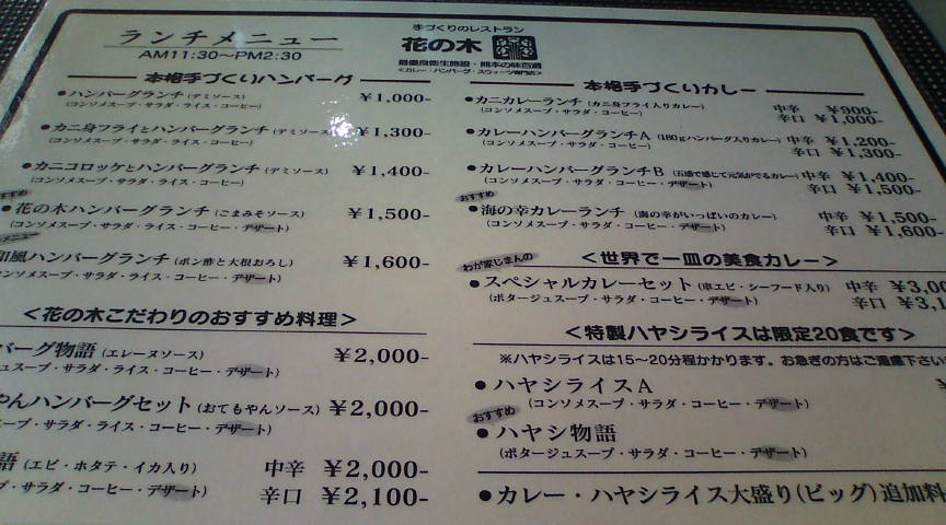 | ●熊本市東部の美味しいお店 最高は 手づくりのレストラン花の木(洋食) 熊本市尾ノ上4-1-21 096-369-8402 営業時間:11:30〜21:30 熊本では老舗の洋食屋です。「一生に一度は食べたい3,000円カレー」という言葉に魅かれて行って来ました。昼飯に3000円と言う方もいらっしゃると思いますが、一生に一度ですから迷わず注文しました。大変手の込んだカレーで、3000円と言うのも分かる気がしました。 |