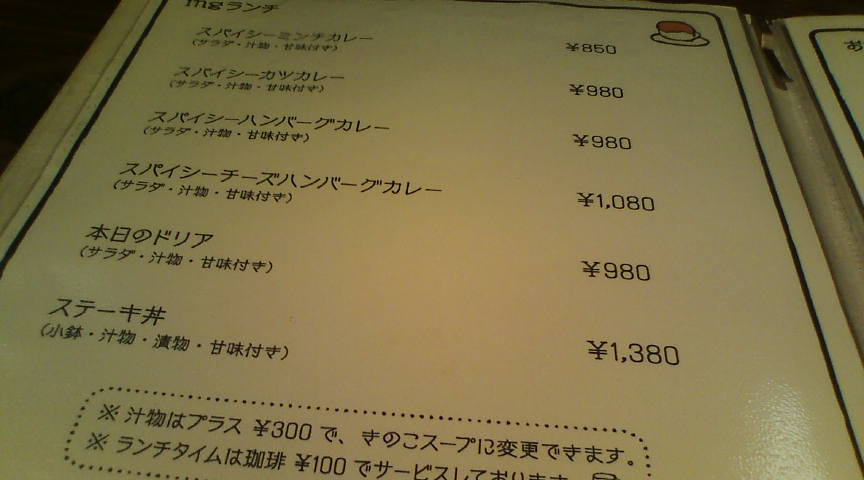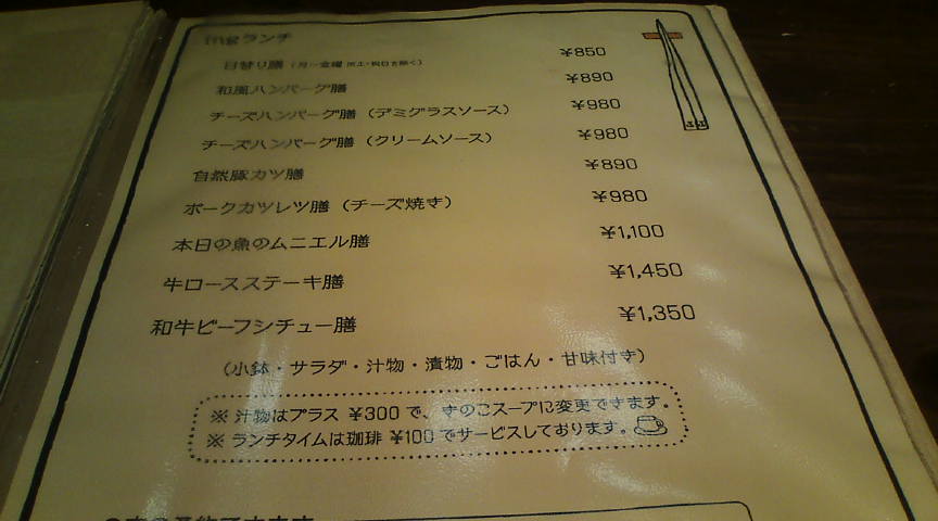 ランチのメニューです。チーズハンバーグ膳(980円)を頼みました。 ![]() メニューの別ページです。カレーにも魅かれましたが、次回のお楽しみにしました。 ![]() チーズハンバーグ膳です。とても美味しそうにチーズがかかっています。 ![]() チーズハンバーグの拡大画像です。見れば見るほど美味しそうです(実際美味しくいただきました)。 ![]() 締めのコーヒーです。渋みがなく美味しかったです。 ![]() |