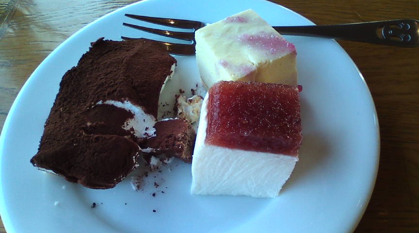 花の果樹園のメニューです。フルーツカレーがおススメとのことで、言われた通り注文しました。 ![]() メイン料理以外は食べ放題です。新鮮な野菜や果物が並んでいます。 ![]() 早速野菜を取って来ました。レタス・ミニトマト・セロリの全てが美味しかったです。 ![]() メインのフルーツカレーです。その名の通りフルーツの味が心地よい美味しいカレーです。 ![]() デザートも一杯いただきました。特にこのティラミス、凄く美味しかったです。しめて1500円です。 ![]() |